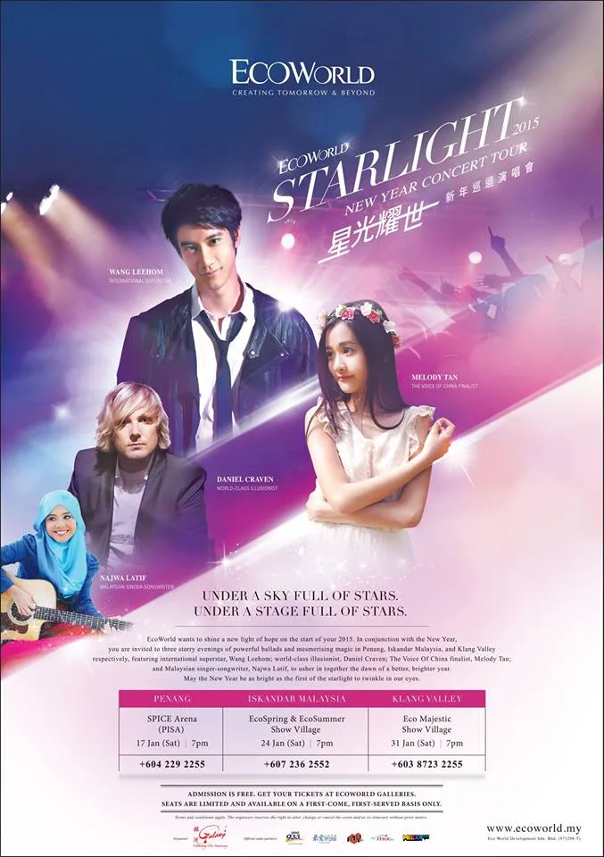In conjunction with New Year, property developer EcoWorld is inviting you to not one, not two, but three evenings of mesmerising tunes in Penang, Iskandar Malaysia, and Klang Valley. This is your golden opportunity to catch “The Voice of China” finalist Melody Tan, world-class illusionist Daniel Craven, our very own Malaysian talent Najwa Latif, as well as the one and only Wang Leehom performing live on stage!