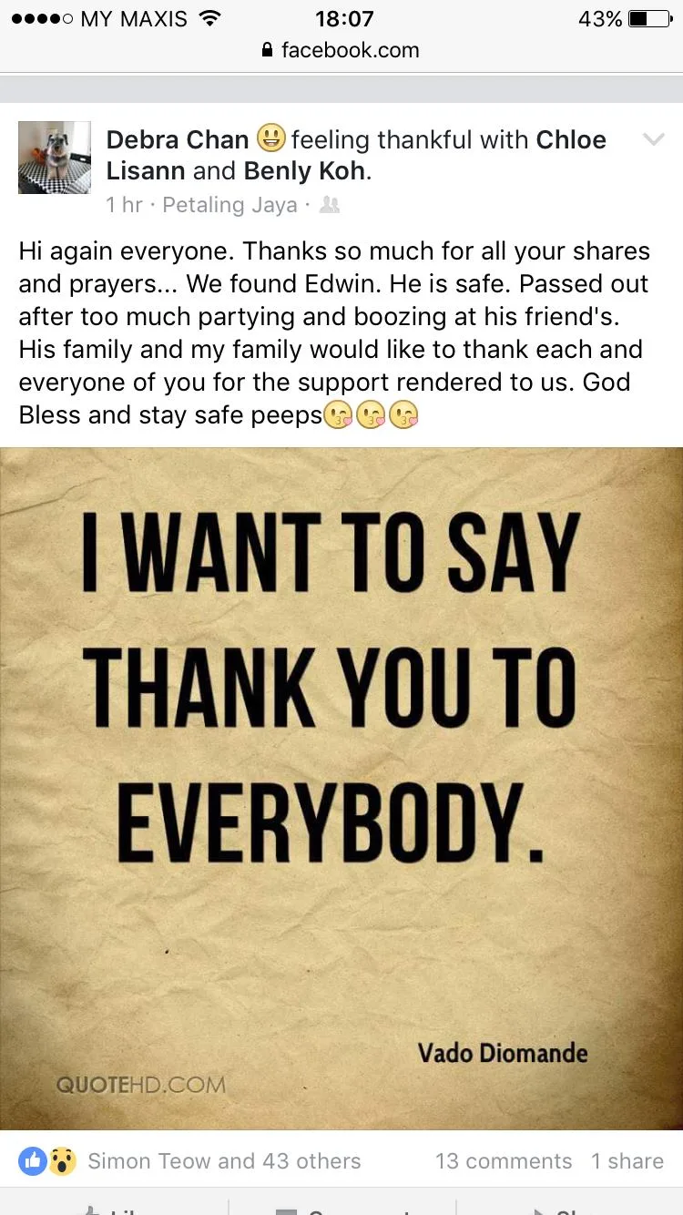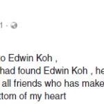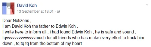 In a Facebook post on Tuesday (13th September), a Facebook user under the name of David Koh, who claims to be the father of Edwin, revealed that the teenager is currently “safe and sound”. He also thanked everyone who made an effort to track down his beloved son.
