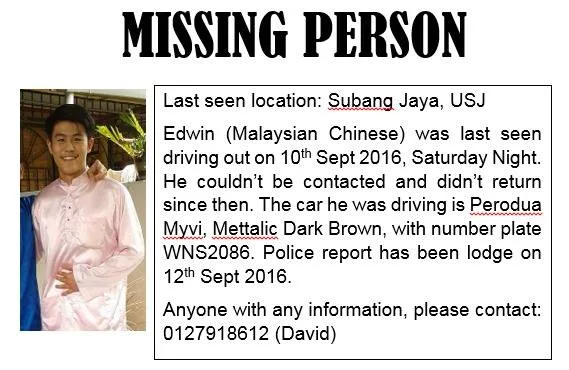 Anyone with info on Edwin’s whereabouts is encouraged to call his father at 012-7918612.