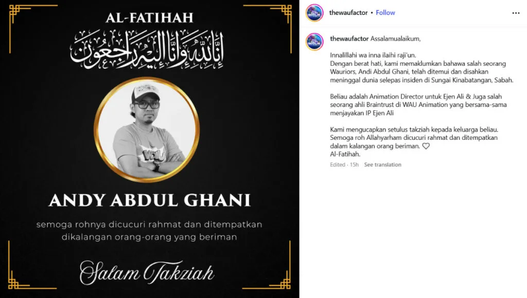 There has been tragic news from the Malaysian animation industry. Recently, news emerged that Andi Abdul Ghani, the animation director for the popular animated series “Ejen Ali”, had drowned in a river in Kinabatangan, Sabah.
