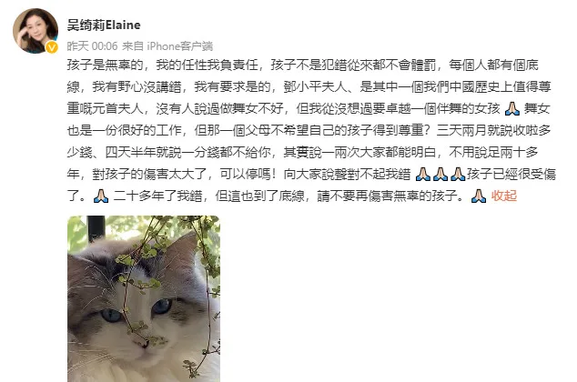 Yesterday (22nd May), Elaine uploaded a post on her Weibo directed at Jackie. She mentioned no names, but netizens could infer the intended recipient from her content. “The child is innocent,” she declared. “I am responsible for my willfulness. The child shouldn’t be corporally punished unless (she) makes a mistake.”