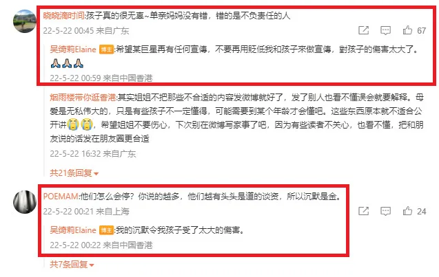 Another netizen opined that she shouldn’t have said anything at all. “(Why) would they stop?” they said. “The more you talk, the more eloquent they have to be, so silence is golden.” However, Elaine firmly disagreed. “My silence has hurt my child too much.”