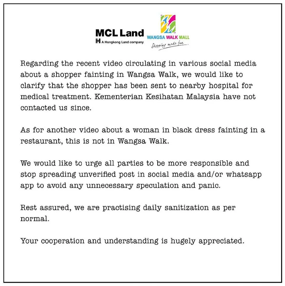 “Regarding the recent video circulating in various social media about a shopper fainting in Wangsa Walk, we would like to clarify that the shopper has been sent to a nearby hospital for medical treatment. Kementerian Kesihatan Malaysia have not contacted us since.