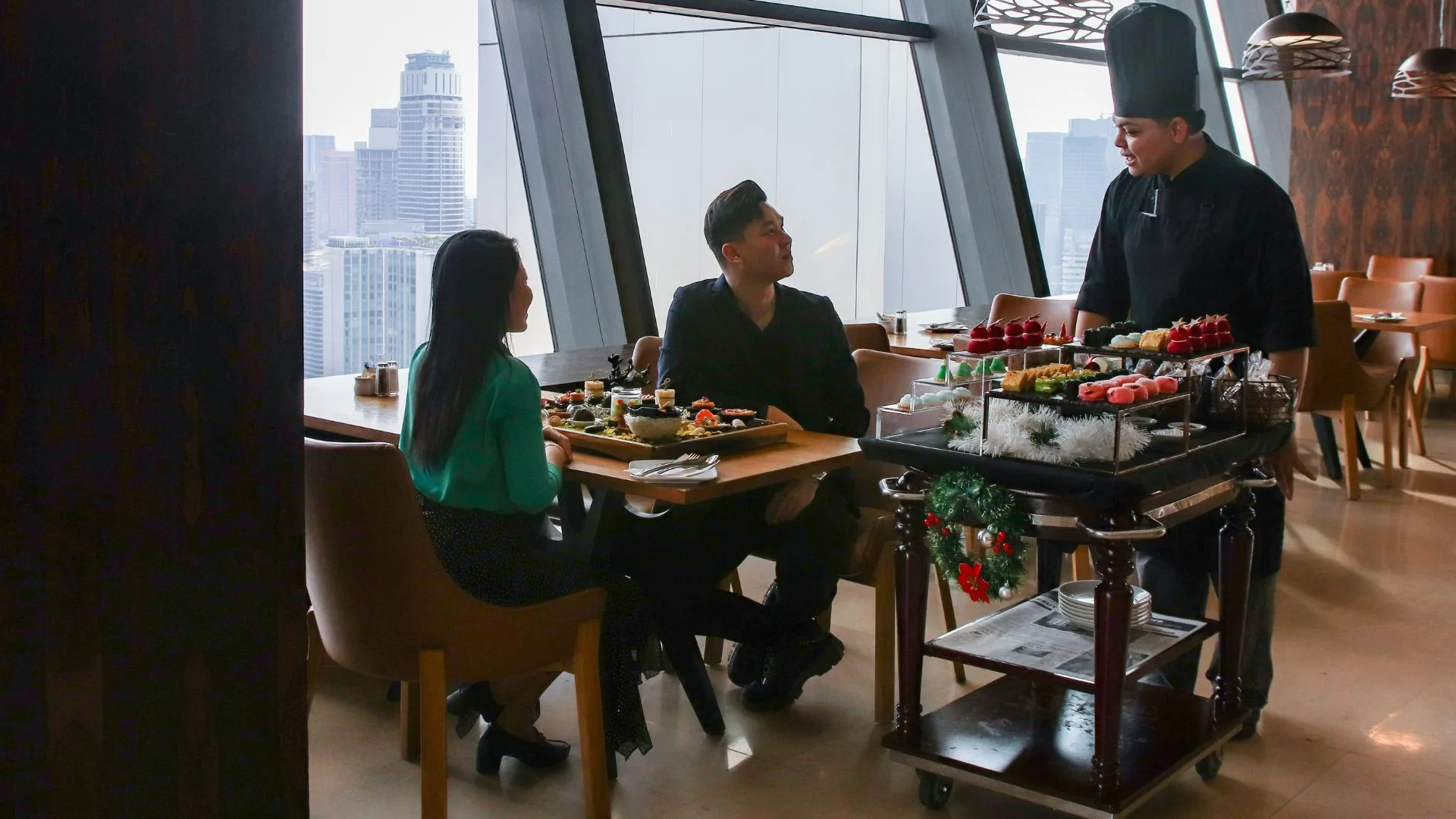 The highlight is the Christmas dessert trolley, offering eight festive sweets with unlimited refills—from Raspberry Mousse Cream Puffs to Rose Lychee Bliss Panna Cotta and classic Fruit Cake. Paired with sweeping skyline views, it creates the perfect setting for leisurely conversations, catch-ups, and savouring the season high above the city.