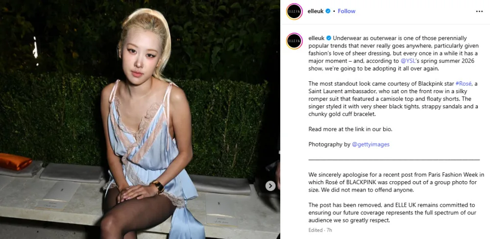 Following the backlash, ELLE UK deleted the original post and uploaded a carousel of photos of Rosé along with an apology that reads, ” We sincerely apologise for a recent post from Paris Fashion Week in which Rosé of BLACKPINK was cropped out of a group photo for size. We did not mean to offend anyone. The post has been removed, and ELLE UK remains committed to ensuring our future coverage represents the full spectrum of our audience we so greatly respect.”