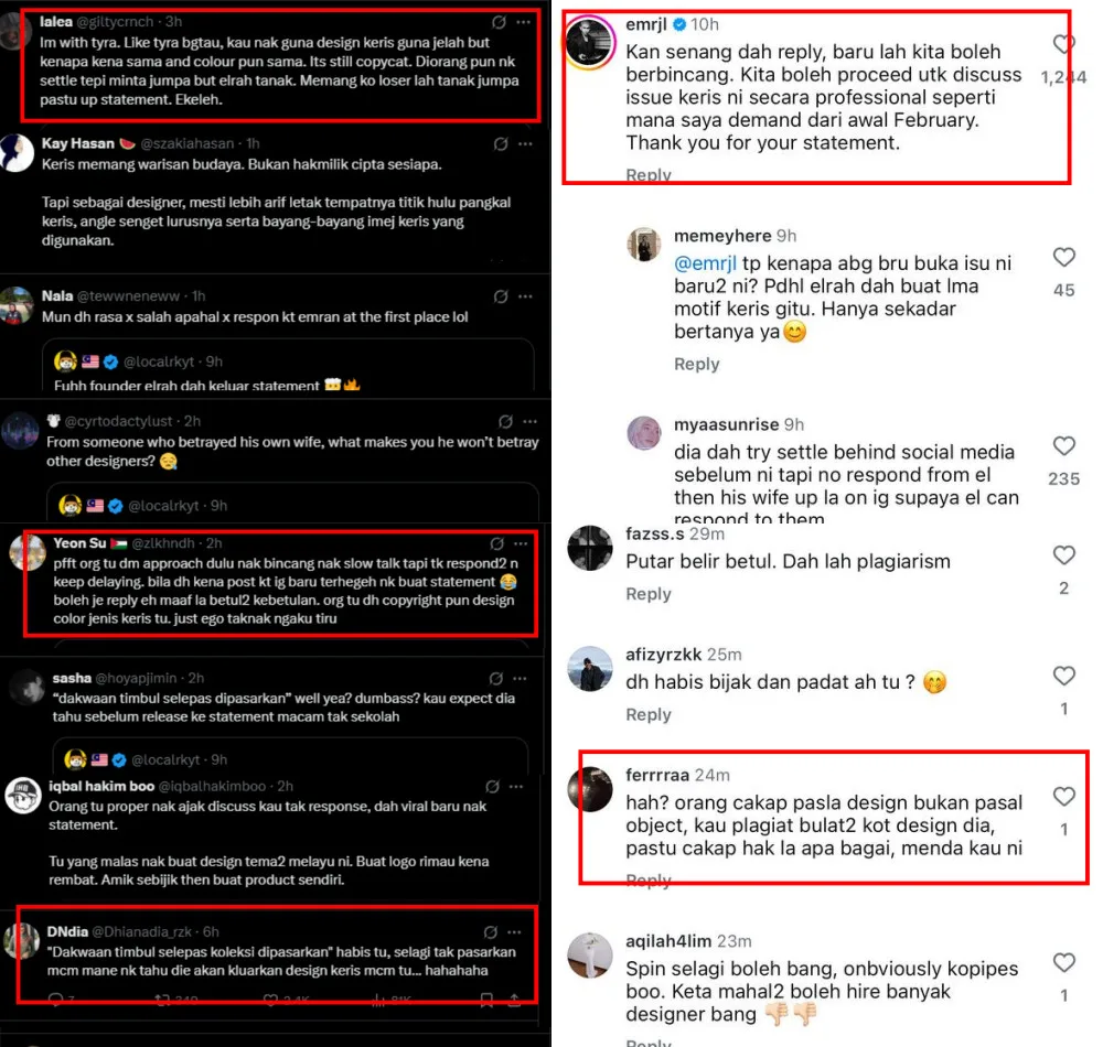 After posting the official statement, many noticed and pointed out flaws in it. According to netizens, El Azman failed to address the actual allegation, which was the overall design itself, rather than the use of cultural elements like the keris. They reiterated Tyra’s previous claims, stating that Elrah Exclusive’s sampin design is strikingly similar to her family’s sampin design, particularly in the position and placement of the weapon and the choice of colours.