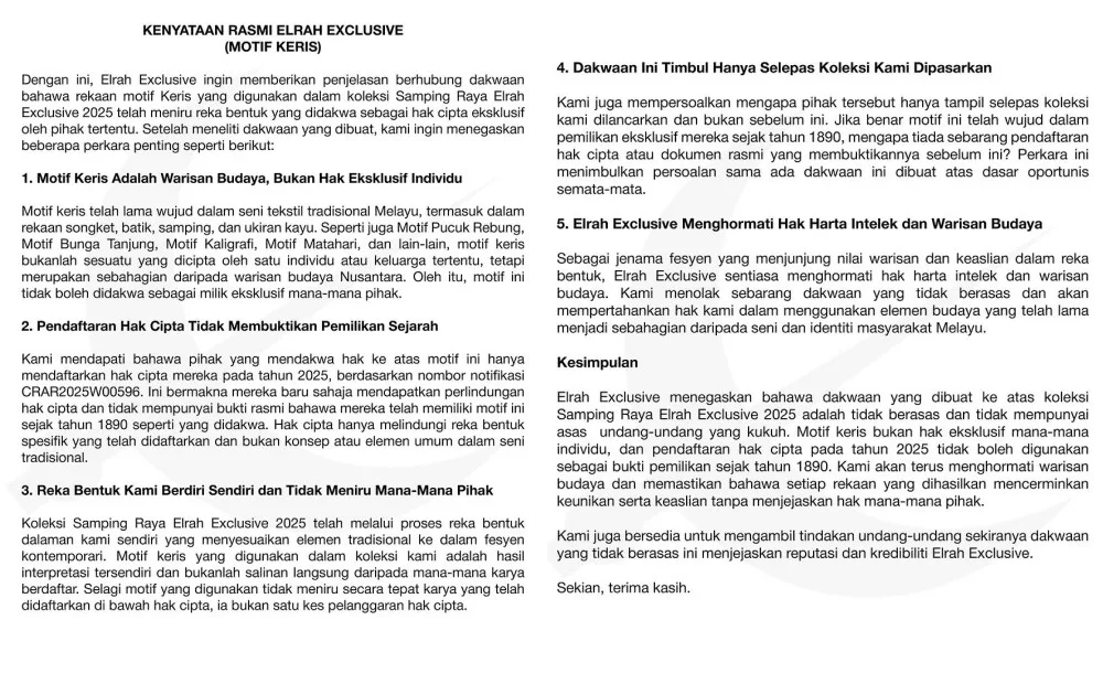 He also pointed out that the family only raised the issue after the brand had officially released the collection, insinuating that they were simply seeking attention and nothing more. “Elrah Exclusive has always respected intellectual property and cultural heritage. We strongly deny the allegations and will defend our right to use cultural elements that have always been part of Malaysia’s identity,” the statement reads.