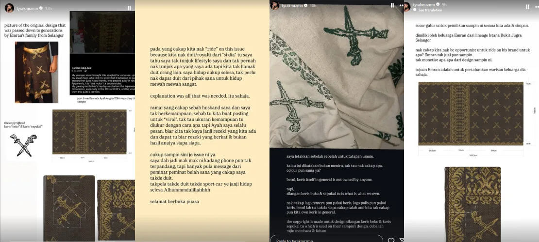 Tyra Kamaruzzaman and Emran responded to the post, saying that all of this could have been avoided if the founder had simply replied to their DMs, which began in February of this year, to discuss the matter. The mother-of-one also insisted that the issue had not been raised recently, as they had been trying to contact El Azman but had not received a proper reply to their request. In her Instagram stories, she provided more evidence of the family’s original design and clarified that they are not seeking attention, but are simply trying to protect Emran’s family heritage.