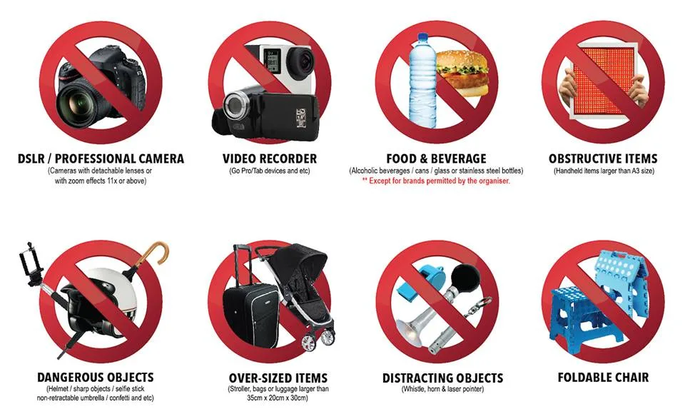 - Objects deemed to challenge public safety including weapon, glass bottle, helmet, sharp item, non-retractable umbrella, selfie stick and confetti etc.