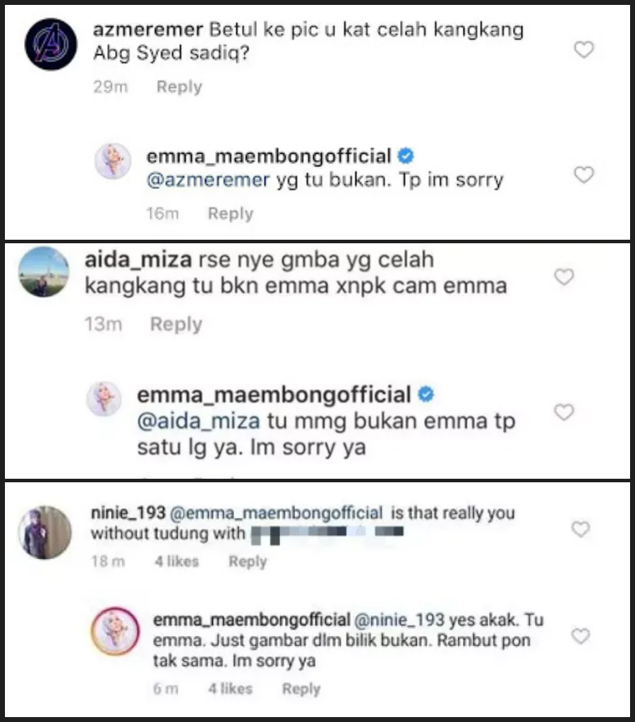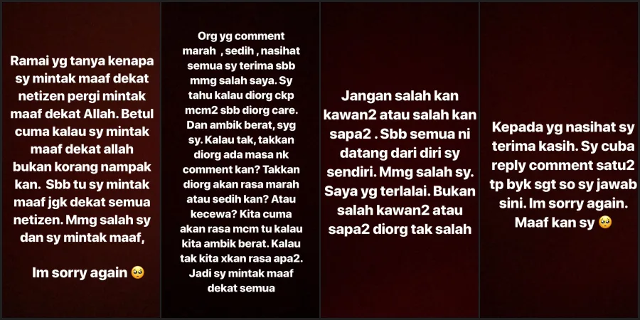 The actress soon issued an apology on her IG stories, admitting that she is the woman in the photo with Syed Saddiq’s brother. However, she denies that it was her who was sitting down in between Syed Abdullah’s legs.
