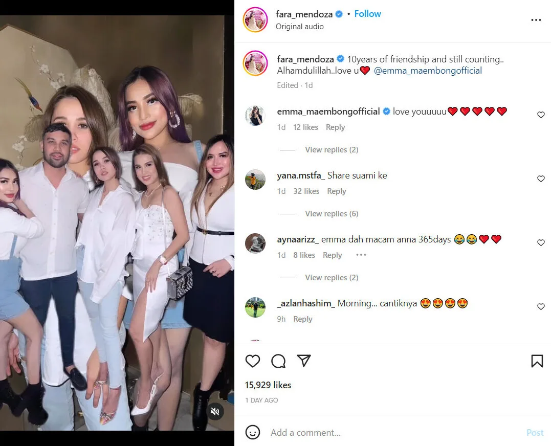 Speaking of Emma’s husband, Shazli also caught the attention of many after he was spotted wrapping his arm around Fara’s waist, as seen in one of the photos shared by the latter. This has in turn sparked a heated debate among netizens. One netizen even questioned whether both Emma and Fara are sharing the former’s husband.