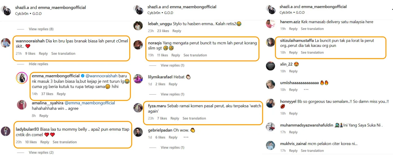 Instead of staying silent, Emma decided to clap back at the internet trolls who body shamed her. The “Kau Yang Terindah” star responded to a fan, “It’s normal since I’m about to enter my third month. But it’s only for a short period of time, I will shed some more weight after this. It’s just that those who condemned me, they still look the same.”