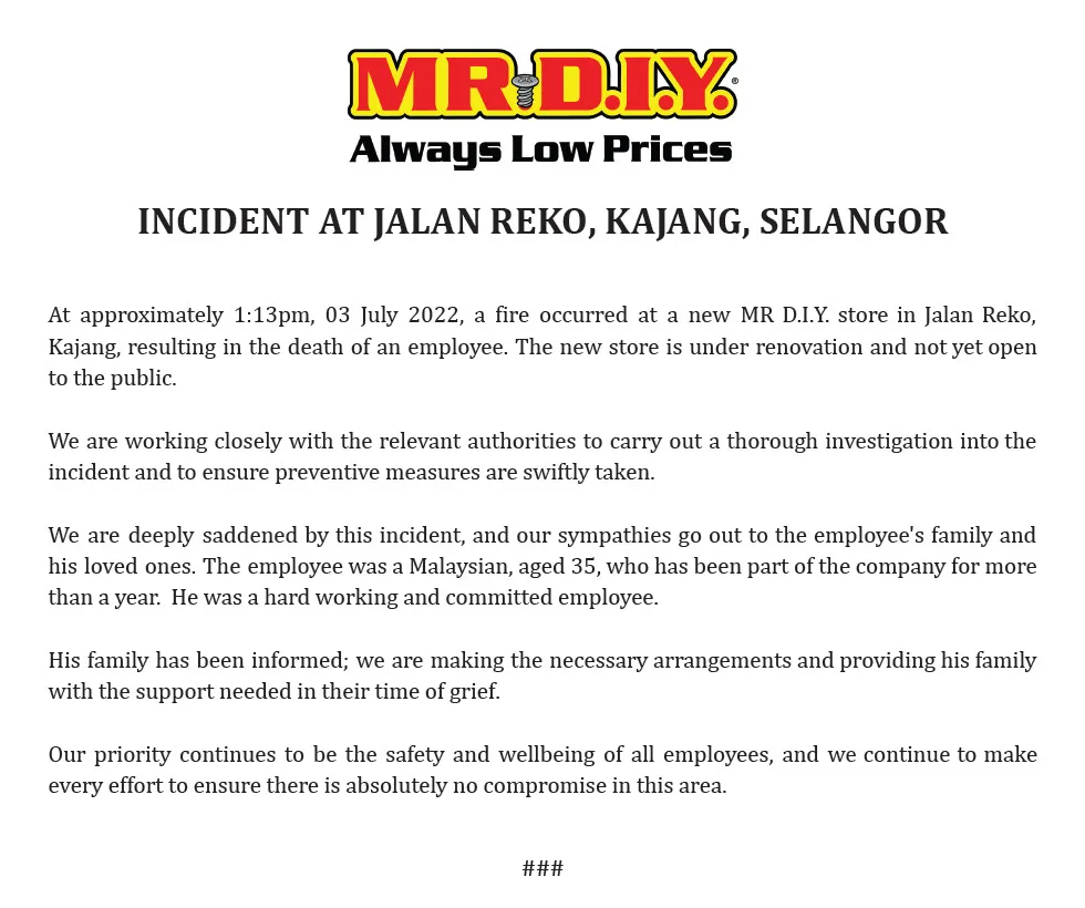 MR. DIY has informed and expressed their condolences to the employee’s family. “The employee was a Malaysian, aged 35, who has been part of the company for more than a year,” the company shared. “He was a hard working and committed employee.” They are also making the necessary arrangements and have promised to provide his family with support during their grief.