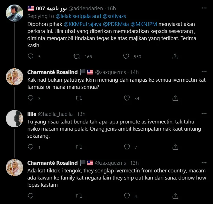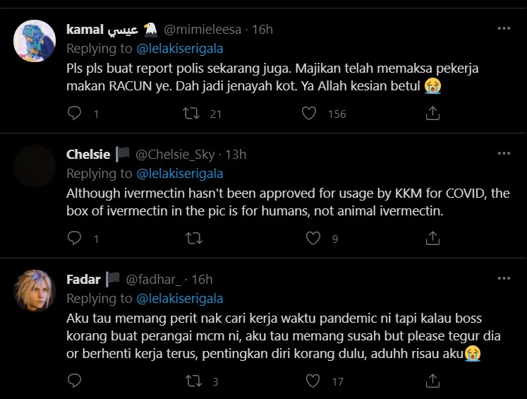 “Remember my sister’s Covid-19 positive case because of the workplace cluster? Today (yesterday), her boss demanded that she take Ivermectin. She was even instructed to consume the drug in front of her boss,” he captioned in the post.