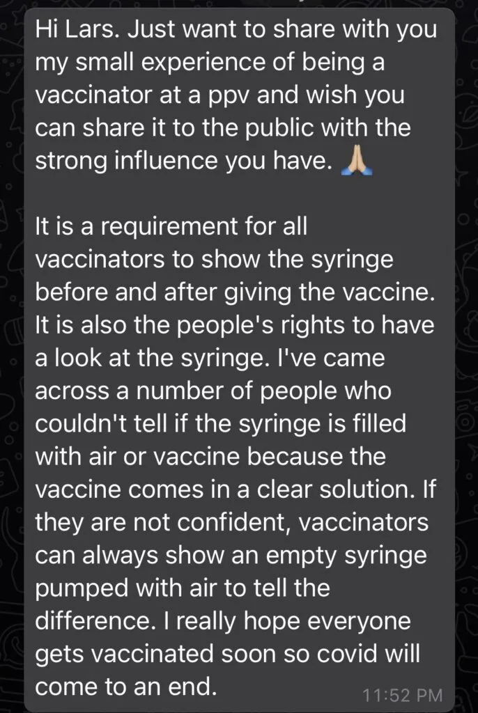 Things may have seemed smooth for a few days, however, another video of a woman being given an empty vaccine made its rounds on social media. This incident occurred at WTC Kuala Lumpur around 9:30pm. The health staff in charge of vaccinating her, did not press the syringe filled with the vaccine. The previously unaware vaccine recipient only knew about this incident when she replayed the video.