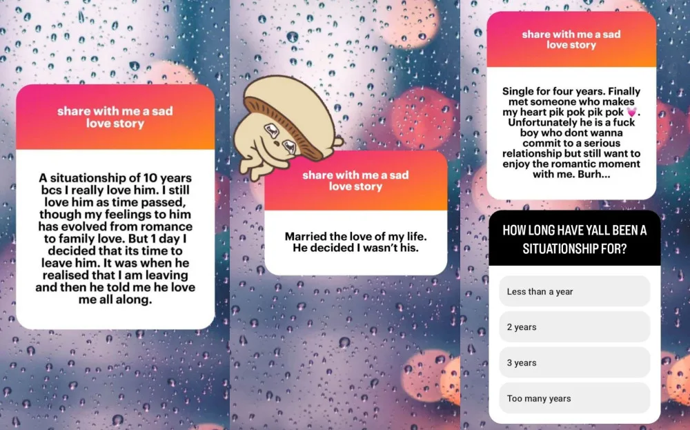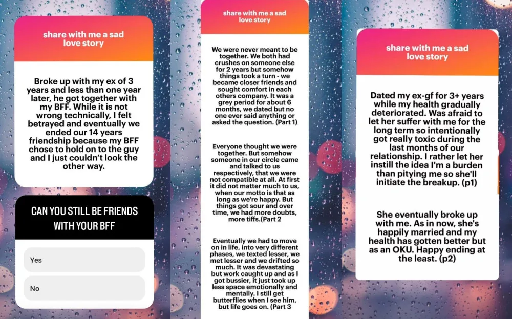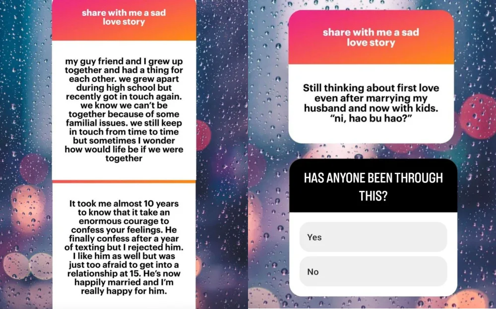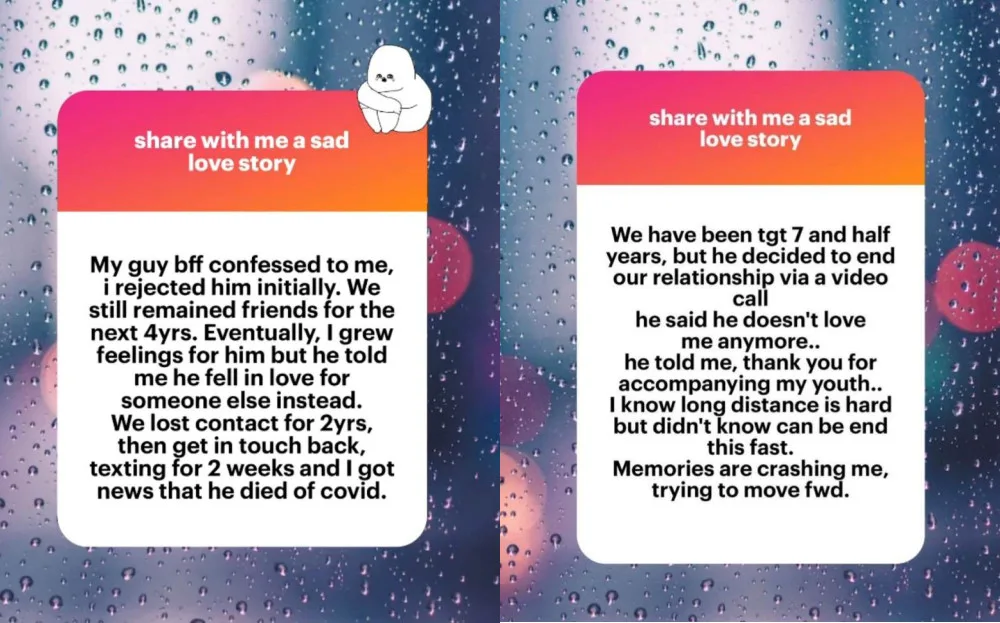 Malaysian influencer Natalie Chai recently got curious about her followers and asked them to share their “sad love stories”. Needless to say, they delivered. Some really tugged on our heartstrings while others left us shaking our heads. Well, to feed your melancholic, bittersweet mood, here are a few love stories to mull over.