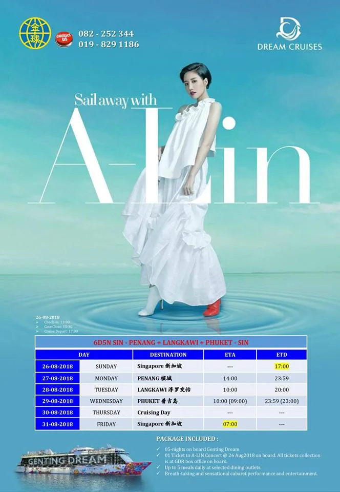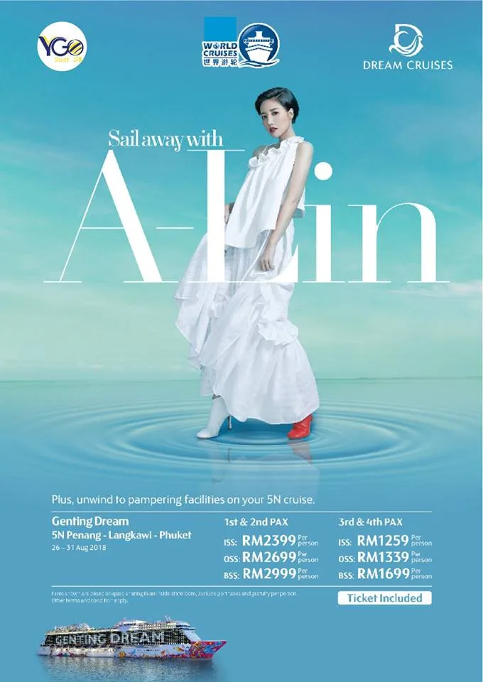 From 26th to 31st August 2018, A-Lin (real name, Huang Li-ling) is set to perform a 60-minute concert on Genting Dream’s 5-night Island Escapade Cruise to Kuala Lumpur, Penang, and Phuket.
