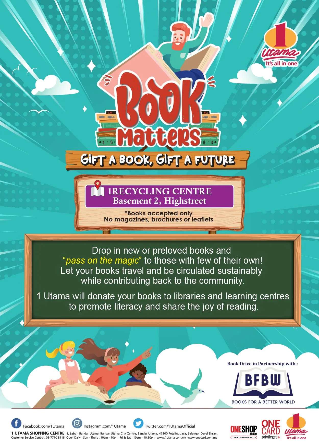 In the spirit of giving, adults and children alike can participate in the “Book Matters” campaign to collect nice points for Santa Claus! Bring any or all books you would like to donate to 1 Utama and drop it off at the “Book Matters” booth located in the town.