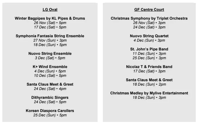 Some of the performances include Scottish bagpipes music performance, marching band, musicals, Santa Claus Meet & Greet, and many more! Happening every weekend, make sure to take a break and enjoy the festivities.