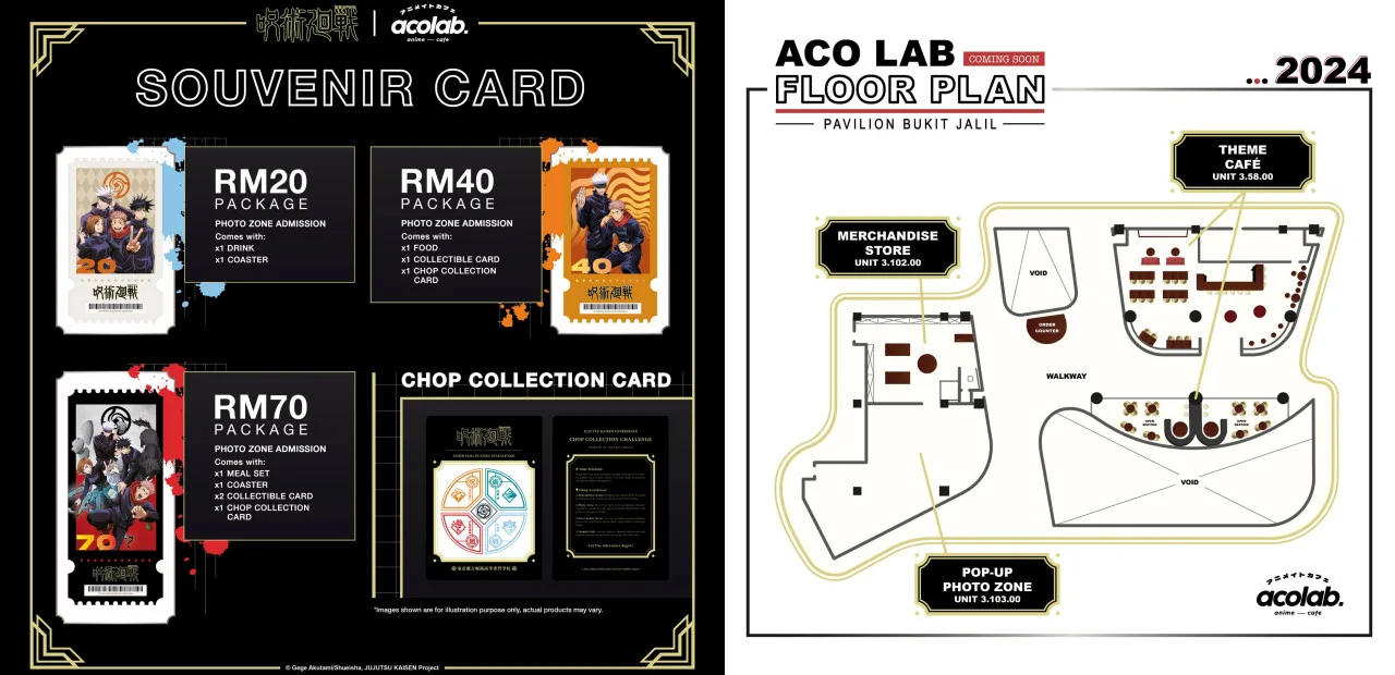 Source: FACEBOOK/ ACO LabsThe pop-up event will be organised by ACO Media and ACO Lab, which is a community that typically hosts anime-themed events for fans to gather and connect through their interest! The Jujutsu Kaisen-themed event will be taking place at ACO Lab cafe at Pavilion Bukit Jalil from 20th April to 20th July 2024. Do take note that the event requires an entrance ticket which can be purchased through the Ticket2U platform. You can even choose your Jujutsu Kaisen packages, which range from RM20 to RM70 with each category providing different benefits for the event!