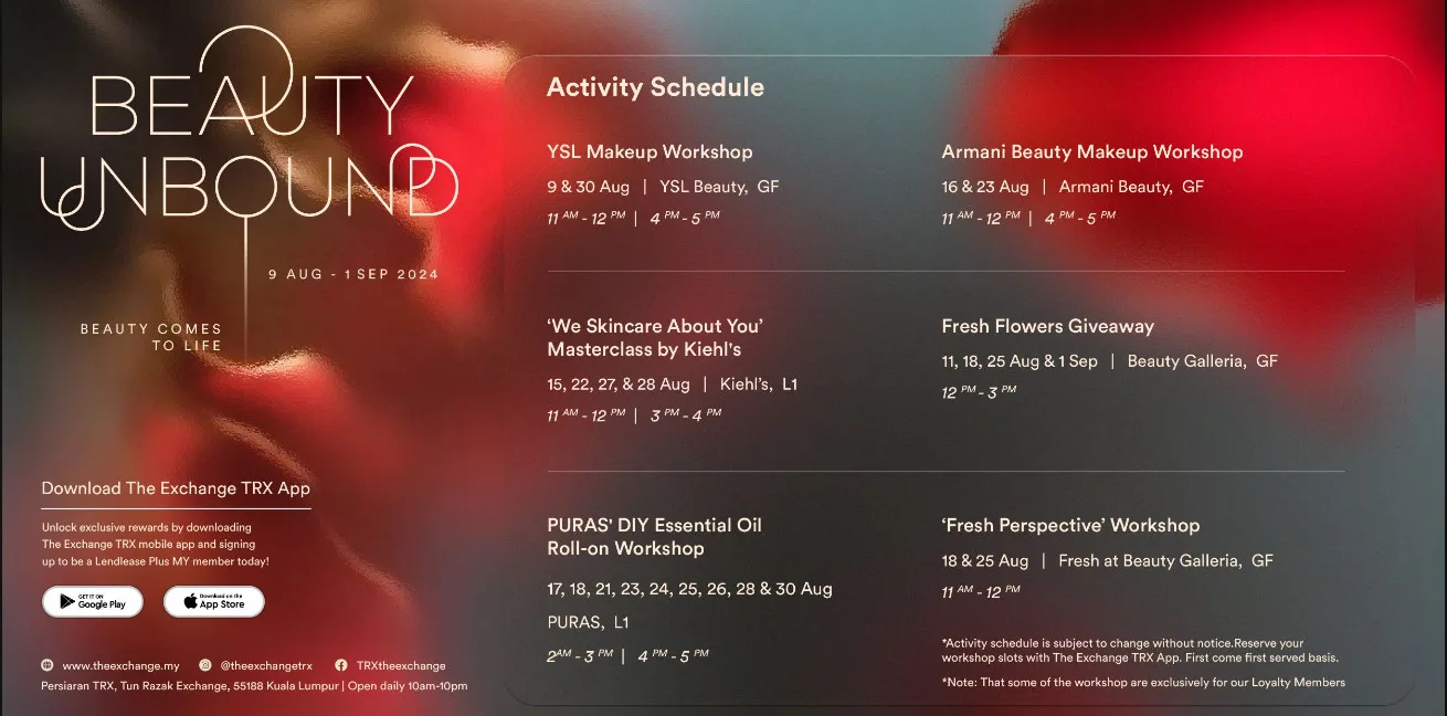 “The Beauty Unbound campaign invites everyone to redefine beauty on their terms, embracing both inner and outer radiance. We believe that true beauty transcends the surface. We aim to inspire our guests to discover how beauty blossoms through the art of self-care and to position The Exchange TRX as the premier destination for beauty enthusiasts by offering a variety of brands, from skincare to hair salons, all under one roof,” said Head of Marketing at The Exchange TRX, Jessica Leong.