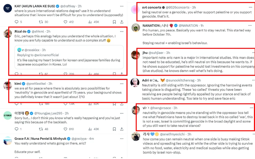 However, many K-pop fans still took offense to the post because they noted that Eric took a “neutral stance” instead of addressing his actions. Netizens believe that remaining neutral on the crisis justifies the Israeli government’s attack on Palestine, which many felt is more akin to genocide than an act of self-defence. The singer’s comment about his cancelled KL show also did not sit well with Malaysians, who said they did not threaten the singer as he claimed but merely voiced to boycott the show.