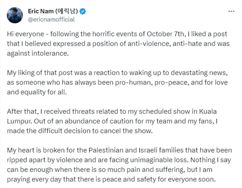 According to Eric, he had liked the post in reaction to the devastating news about the war. However, he then received threats related to his scheduled Kuala Lumpur show because of this. Eric said, “Out of an abundance of caution for my team and my fans, I made the difficult decision to cancel the show.” He then goes on to express his grief for the victims of the war and those who were affected by it.