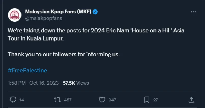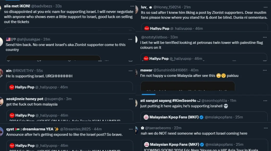 Shortly after sharing the announcement, both Hallyu Pop and Malaysian Kpop Fans Twitter pages deleted the concert post with the latter thanking netizens for informing them of the situation along with the hashtag #FreePalestine. So far, neither Zepp KL nor Eric released a statement regarding the backlash the latter is facing after announcing his concert at the famous venue.