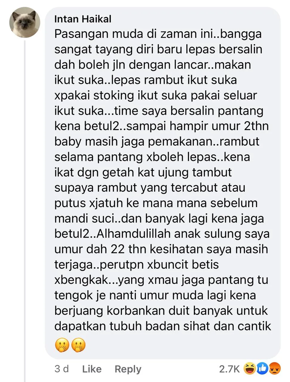 The netizen with the display name of Intan Haikal said, “Young couples nowadays are so proud that they can walk normally right after giving birth, eat whatever they want, let their hair down, not wear socks or trousers and go about as they like.”