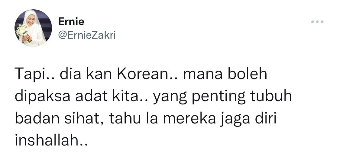 The annoying comment did not only invite even more hateful comments underneath it, but even Malaysian singer Ernie Zakri chimed in on this matter. She quoted a tweet of a netizen who reposted the issue on Twitter and added, “But she’s Korean. You can’t force our traditional customs on her. What’s important is she’s physically healthy. They’ll know how to take care of themselves. God willing.”