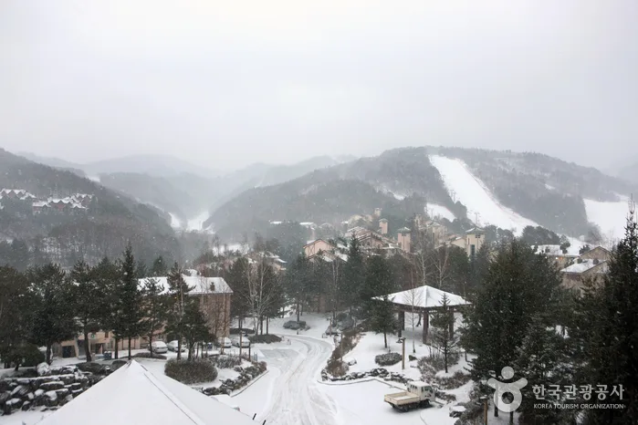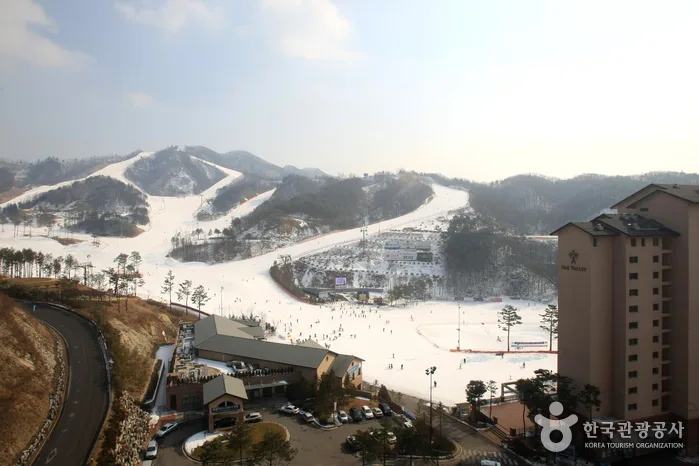Hansoi Oak Valley includes 9 themed slopes, express lifts, and world-class half pipe courses. Oak Valley Snow Park is a fusion project that combines a ski resort, golf course, and condominiums. The resort features slopes along snow-covered oak forests designed by world-renowned Snow Engineering from the US and a golf course designed by Robert Trent Jones, Jr.
