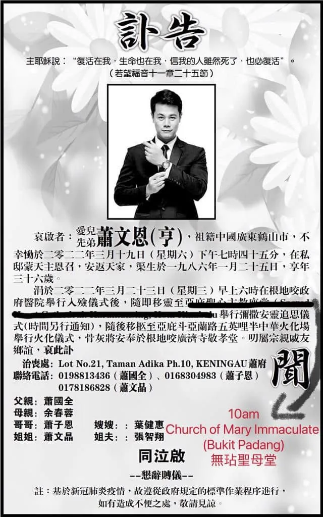 Evan’s sister Emily has announced that his funeral will be held at Church of Mary Immaculate (Bukit Padang), 88300, Kota Kinabalu, Sabah on Wednesday (23rd March).