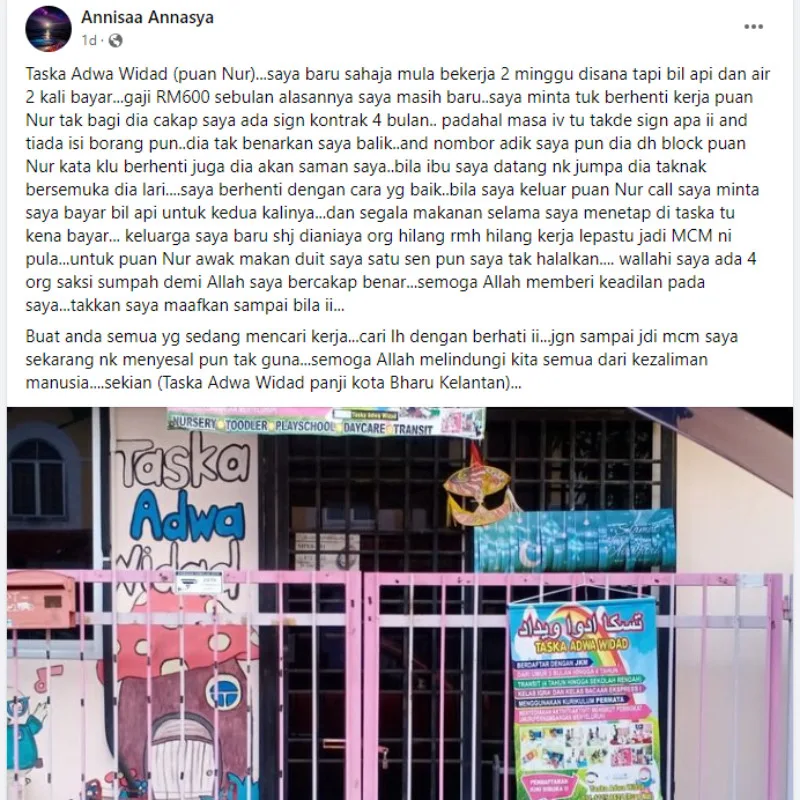 Yesterday (Monday, 5th June), a netizen who goes by Annisaa Annasya posted on the Iklan Jawatan Kosong Kelantan Facebook page about her experience of working at a daycare centre called Taska Adwa Widad. The ex-employee claimed that she had to pay for the electricity and water bills after only 2 weeks of working. “I was only paid RM600 a month and was told to contribute because I was new here,” she wrote.