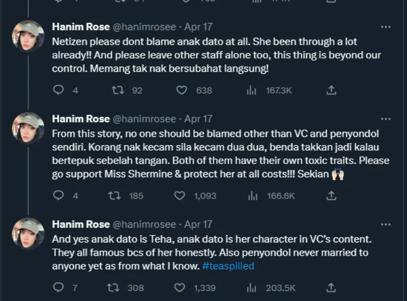 Apparently, the employees actually tried to warn Shermine about her husband’s infidelity but she loved him too much at the time to believe their warnings. As for Mira, Hanim accused her of being just as terrible as the influencer as she took advantage of her relationship with her boss. The Twitter user ended the thread by advising netizens to not come for View Chin’s wife and daughter as she believes they are innocent.
