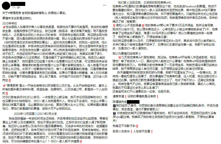The former girlfriend, surnamed Lau, apparently first heard about her boyfriend’s allegations when a friend alerted her to the mess. Ms. Lau immediately realised what had happened and took to Facebook to clear her name. According to her, the mess started in 2020 when she invested money in his business. She apparently invested RM350,000 after listening to his advice.