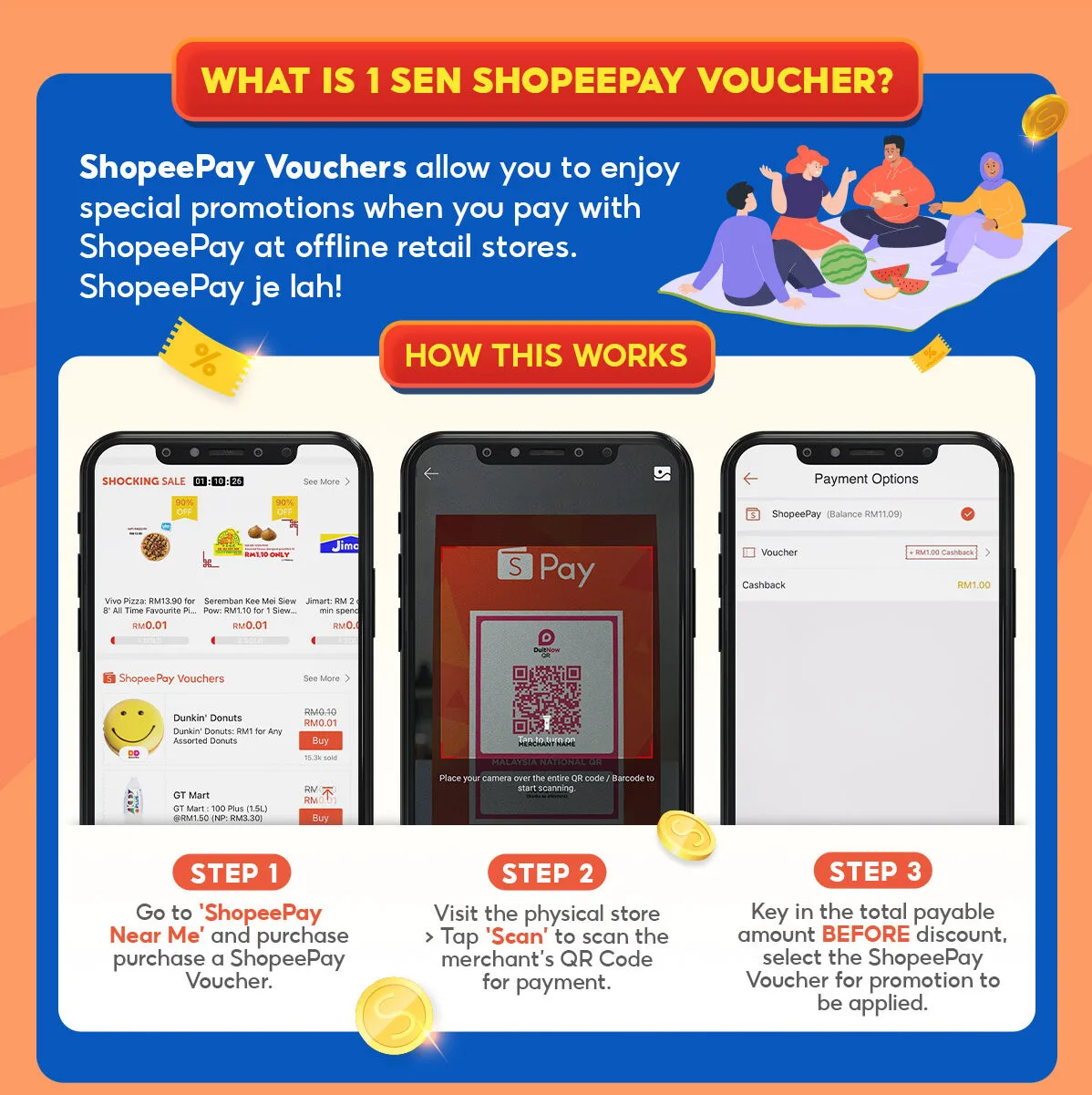 Go to ShopeePay Near Me on your Shopee app and purchase a ShopeePay voucher for just 1 SEN. Next, visit the retail store and tap ‘Scan’ to scan the merchant’s QR code when you pay.
