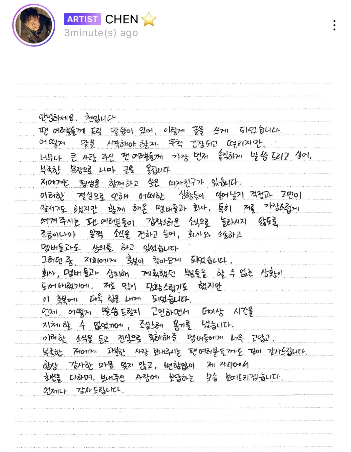 “Hello, this is Chen. I have something to say to my fans, so I wrote this letter. I don’t know how to start, so I am very nervous. I wanted to be the first one to tell my fans who I love so much, so I am leaving this post even with my lacking sentences.