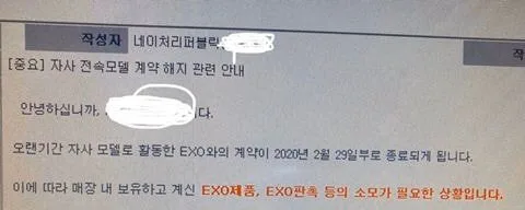 The translated statement reads, “Hello, our contract with EXO, who has modelled for the brand for a long time, will come to an end on 29th February 2020. Regarding this, you need to use all of the stock of EXO-related products.”