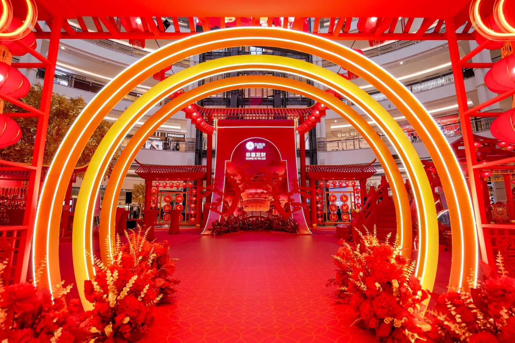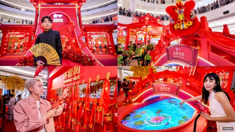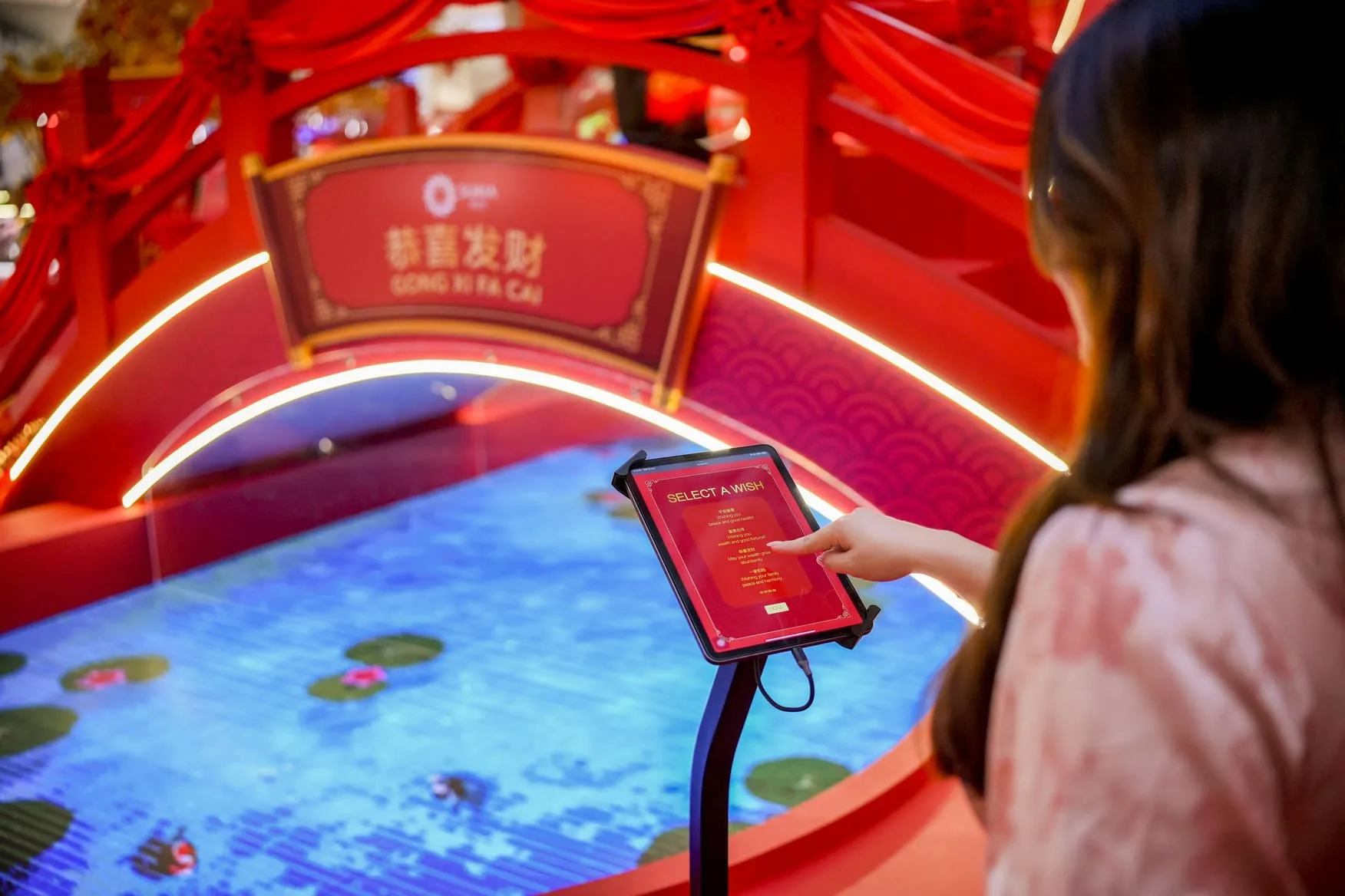 The highlight is a picturesque bridge spanning an interactive digital koi pond—a magical feature where shoppers can select heartfelt wishes and watch them bloom beautifully on the water’s surface. Towering above it all is the Gold Blossoming Tree of Prosperity, a stunning symbol of abundance and good fortune that radiates the spirit of the season.