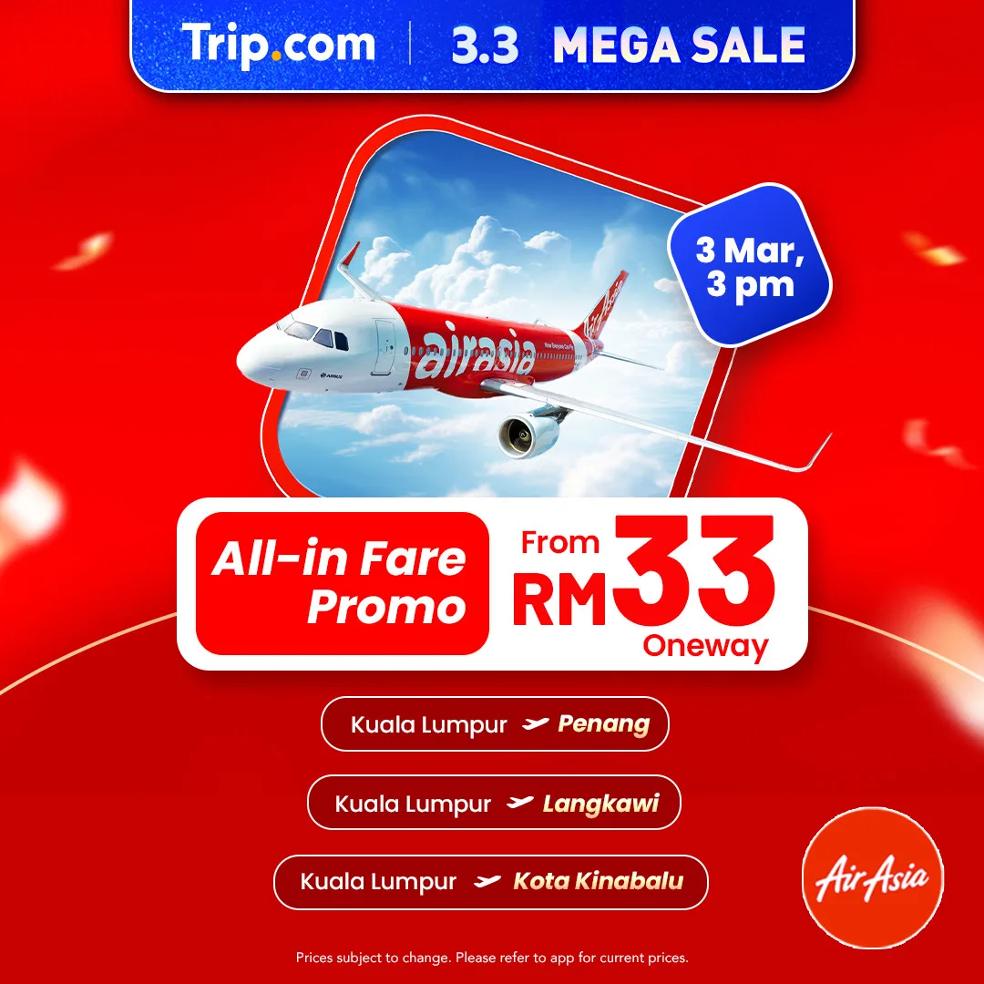 - Flights from RM33: Enjoy one-way all-in fares from RM33 with AirAsia on select domestic routes (Kuala Lumpur to Penang, Langkawi, and Kota Kinabalu).