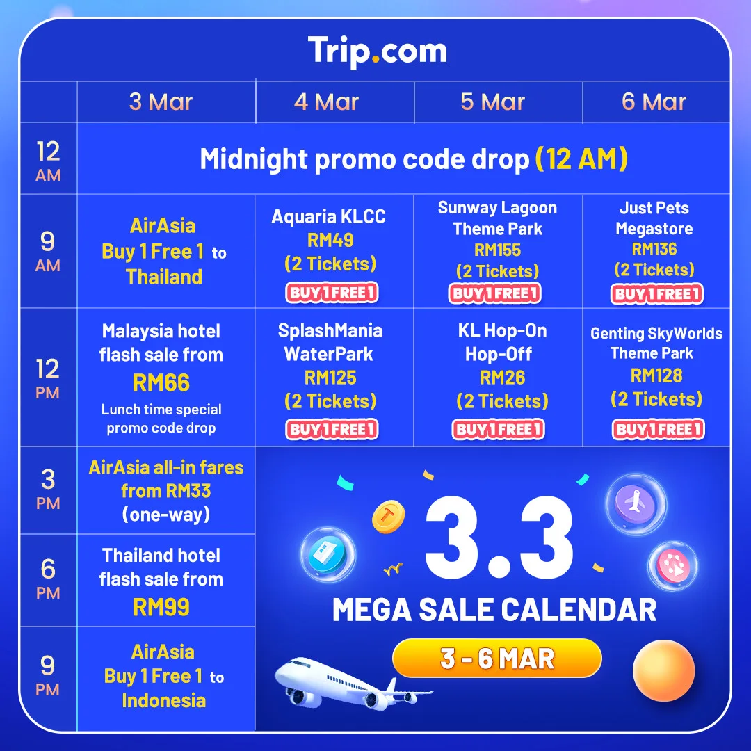 With limited slots and first-come-first-served flash deals, travellers are encouraged to act fast to secure the best discounts during the Trip.com Malaysia 3.3 Mega Sale.
