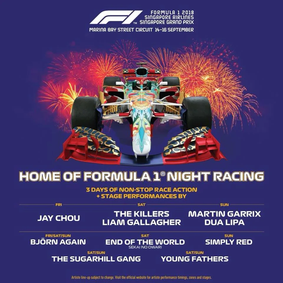 The entertainment lineup for the 2018 Formula 1 Singapore Grand Prix has been unveiled.