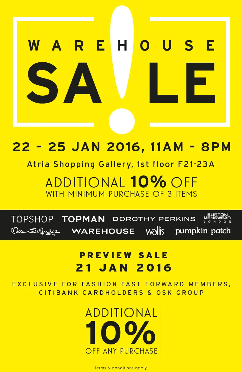 - 21st January: Member’s preview (One day only, for Fashion Fast Forward members and Citibank cardholders) *Additional 10% off any purchase.