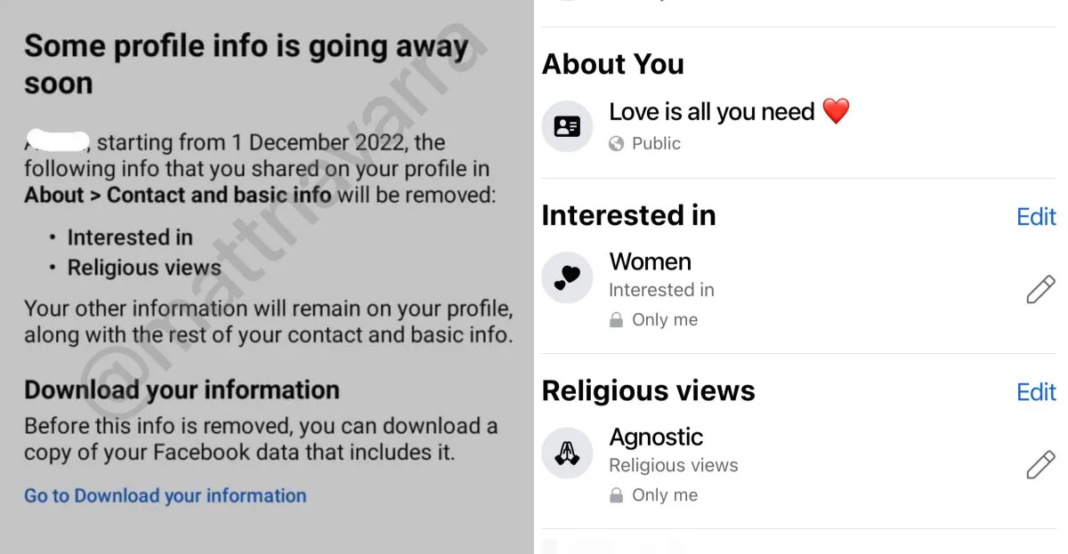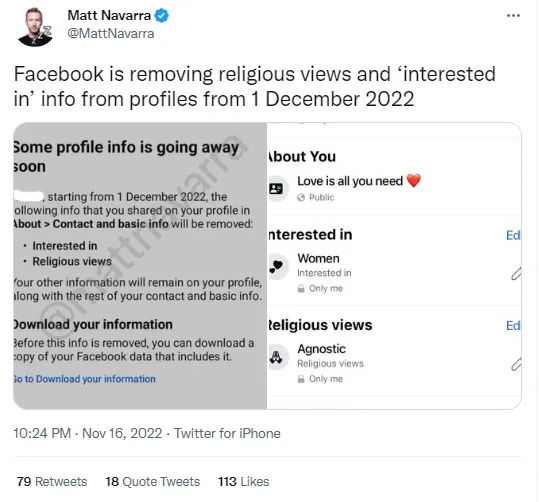 Consultant Matt Navarra was the first to discover the change. Apparently, he had received a notification regarding the new update which he then posted to his Twitter. “Facebook is removing religious views and ‘interested in’ info from profiles from 1st December 2020,” he reported.