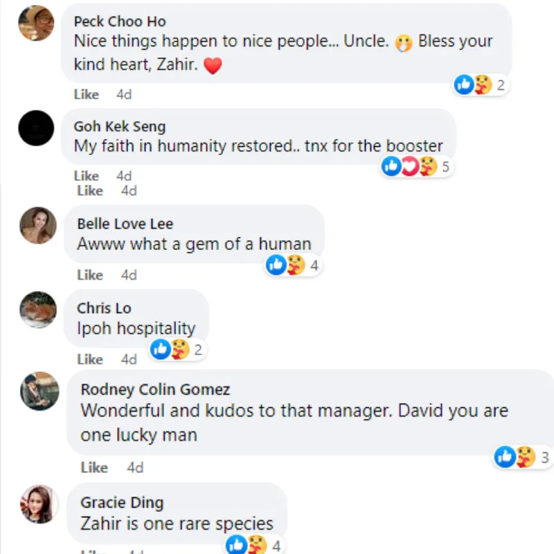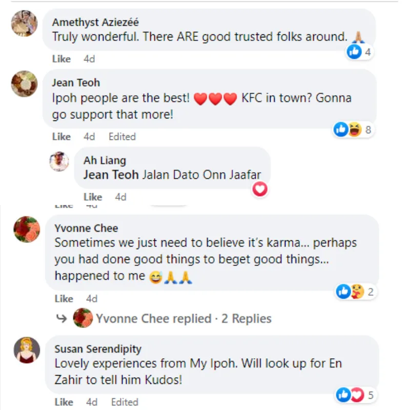 The Facebook post has since been flooded with comments by netizens thanking Ah Liang for sharing the heartwarming story and praising Zakir (as referred by Ah Liang) for his kindness. May the KFC manager’s good deeds be rewarded some day.
