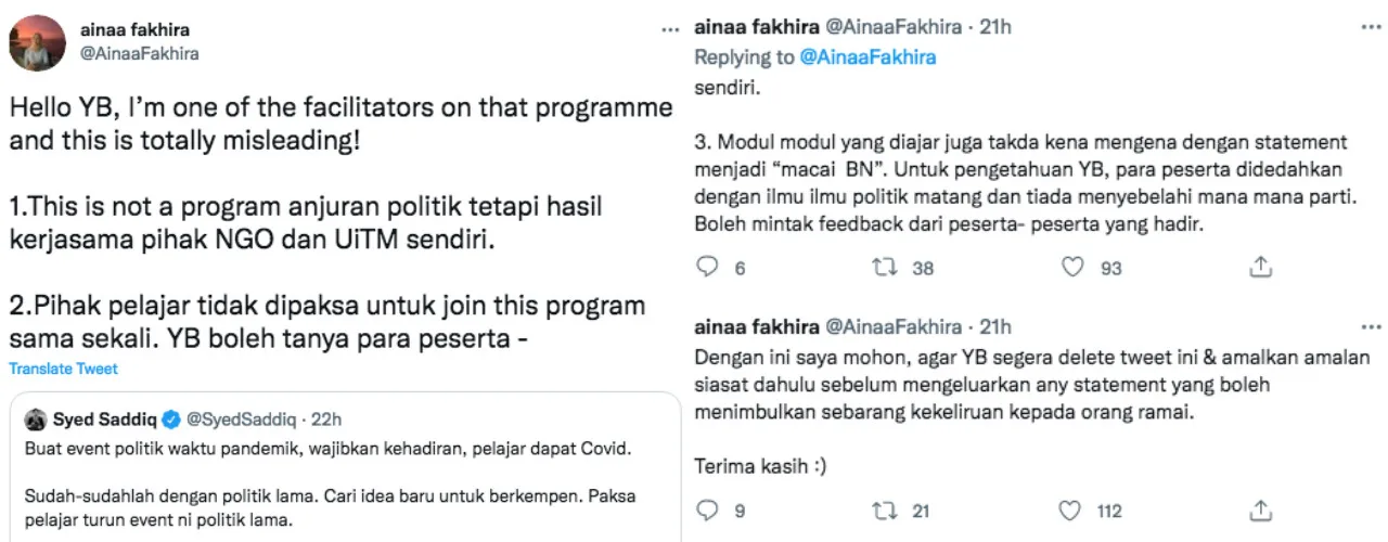Not long after Syed Saddiq posted on his Twitter, a netizen, claiming to be a facilitator for the programme, came forward to clear the air on the allegations left by the former Youth and Sports Minister. As clarified by user @AinaaFakhira, the programme was not organised by a political party, instead the event was held by UiTM itself in collaboration with the NGOs.