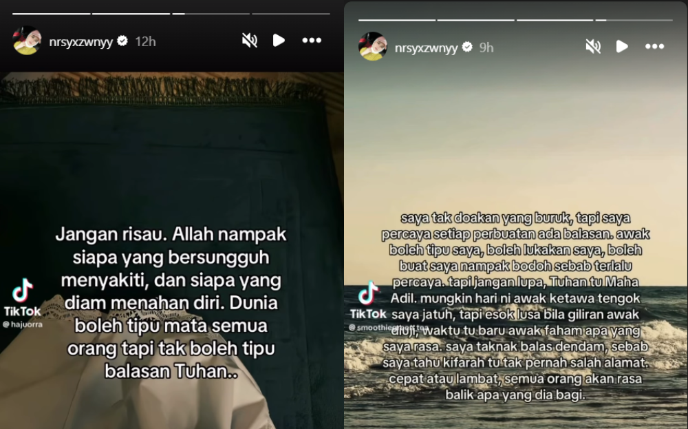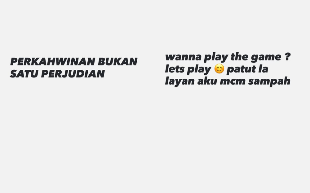 On 9th November 2025 (Sunday), Nur Syazwani took to Instagram Stories to share two posts, hinting at a disagreement with someone. One of the posts writes, “Marriage isn’t a gamble,” while the other writes, “Wanna play the game? Let’s play. No wonder you treat me like trash.” A few hours later, the social media personality would share a couple more Stories, alluding to some issues in her private life.