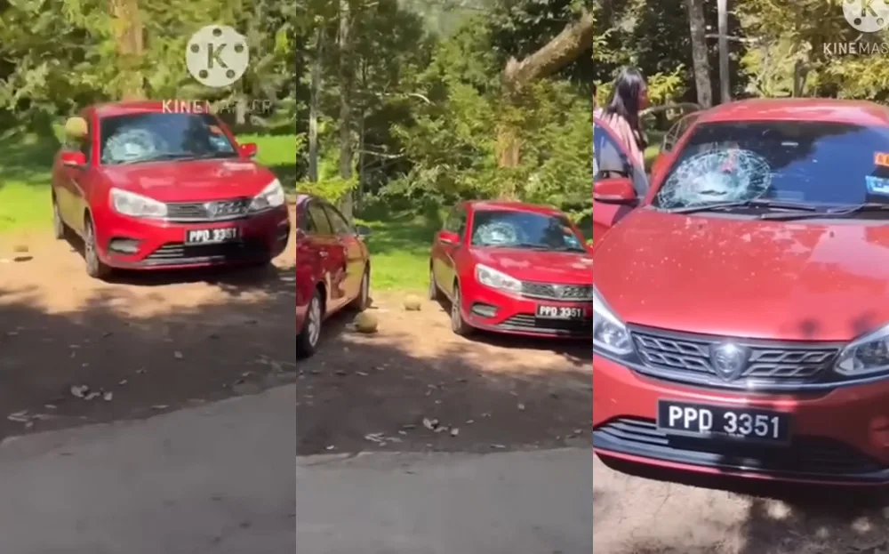 A group had apparently been visiting a durian orchard when they witnessed some durians falling from a tree. Luckily for them, the durians missed them! However, they did hit a car and shattered its windshield. Needless to say, most were grateful that only the car had been hit.