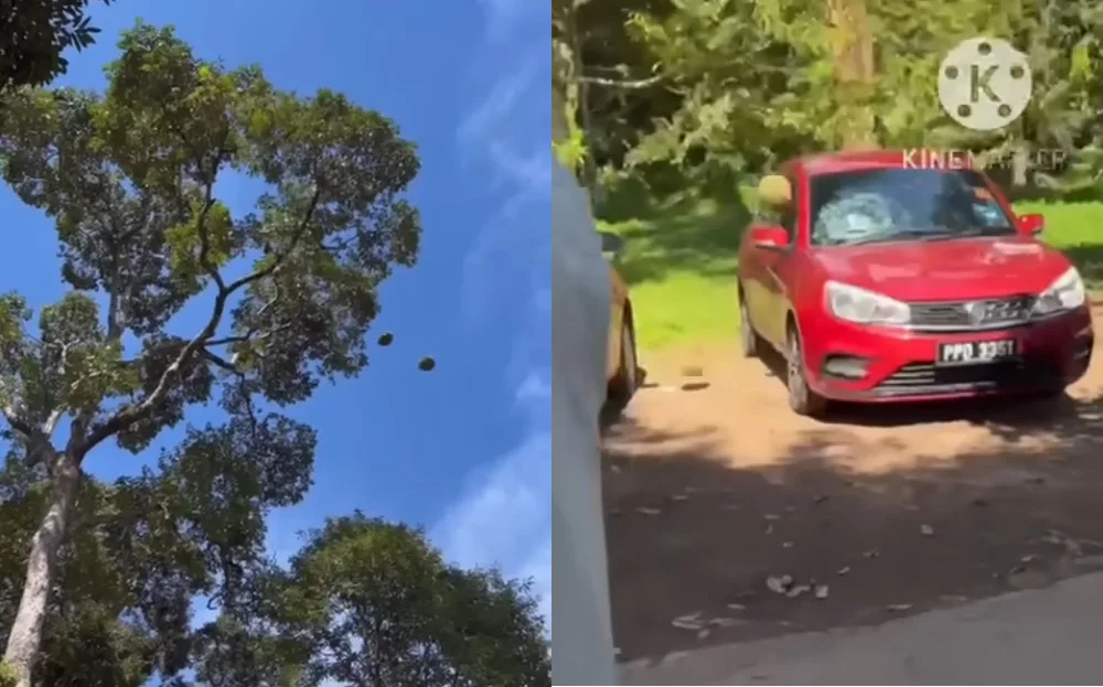 A group had apparently been visiting a durian orchard when they witnessed some durians falling from a tree. Luckily for them, the durians missed them! However, they did hit a car and shattered its windshield. Needless to say, most were grateful that only the car had been hit.