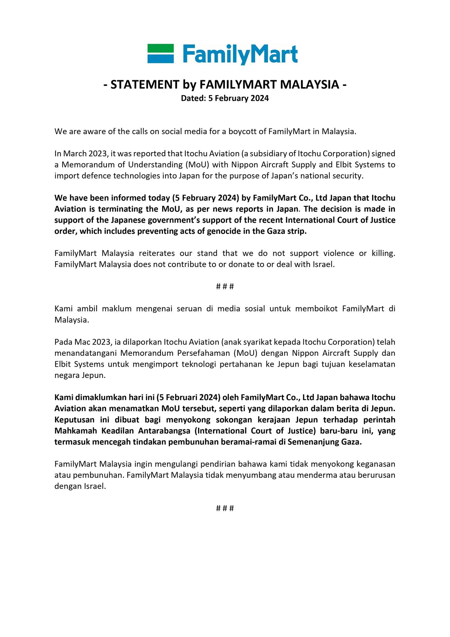 In the statement released yesterday (5th February) through FamilyMart Malaysia’s social media pages, the convenience store chain wrote that the company was aware of the calls for boycotts from netizens. However, the company reiterates that its parent company, Itochu, have ceased its partnership with the deference contractor company and no longer has ties to the company. FamilyMart Malaysia then ends the statement by affirming that they do not support violence or killing and adds that they will not contribute to, donate to or deal with Israel.